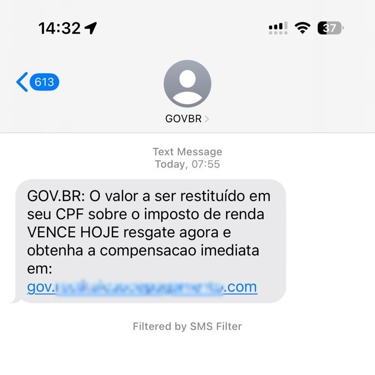 Tudo começa em um SMS com um alerta falso de que o valor a ser restituído no Imposto de Renda está prestes a vencer e que, para o contribuinte receber o pagamento imediatamente, é preciso clicar em um link.