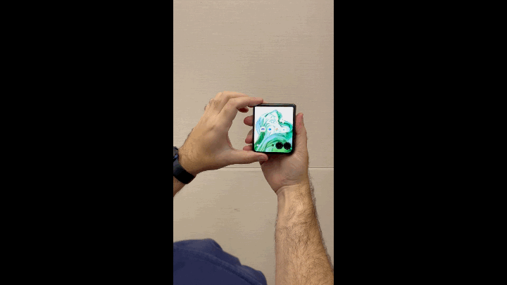 Ao deixar o telefone dobrado ao meio, dá para segurar por um dos lados como se fosse uma filmadora antiga e a gravação começa de forma automática.
