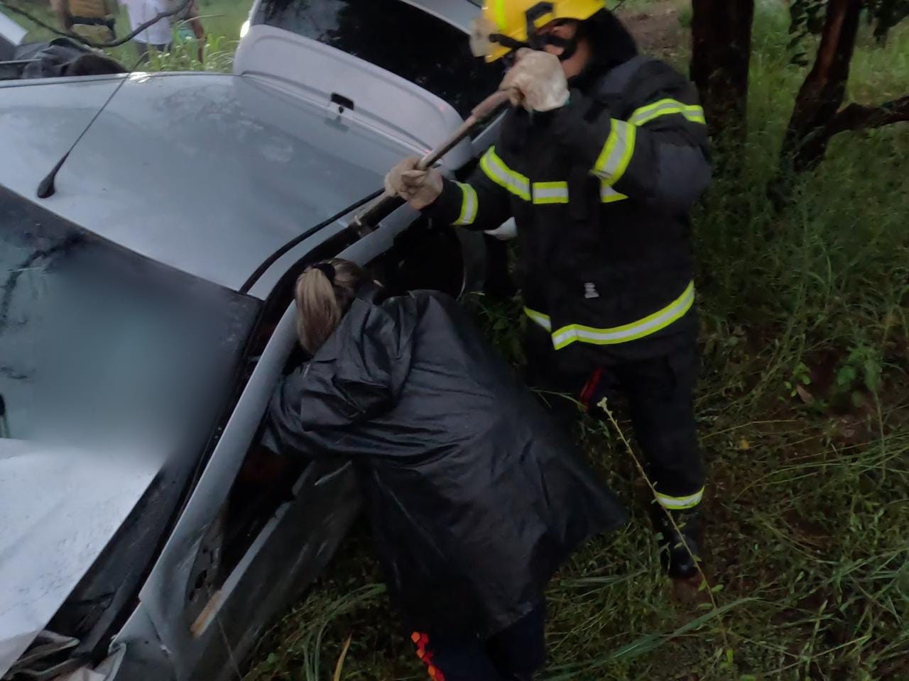 Acidente aconteceu em Araguaína, próximo ao loteamento Veneza. Vítimas foram levadas para o hospital e um dos motoristas foi internado na sala vermelha. Bombeiros retiram motorista de carro após acidente na rodovia TO-222