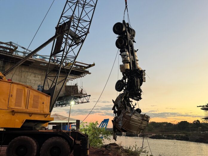 Um dos caminhões que estava no fundo do Rio Tocantins desde o desabamento da ponte Juscelino Kubitschek, em dezembro de 2024, foi retirado da água nesta quinta-feira (4). O trabalho complexo precisou do apoio de mergulhadores, balões de flutuação e guinchos.